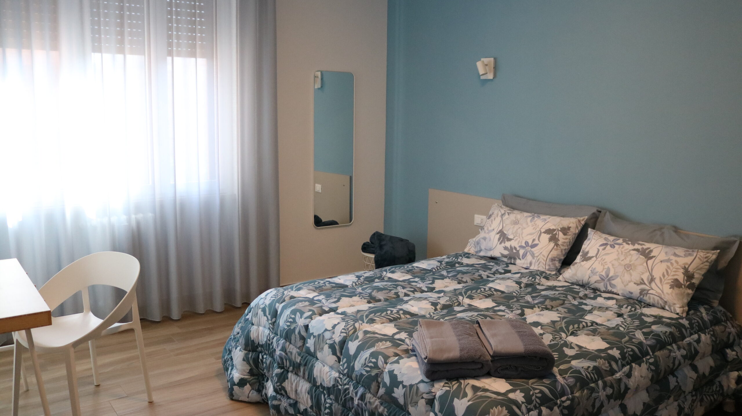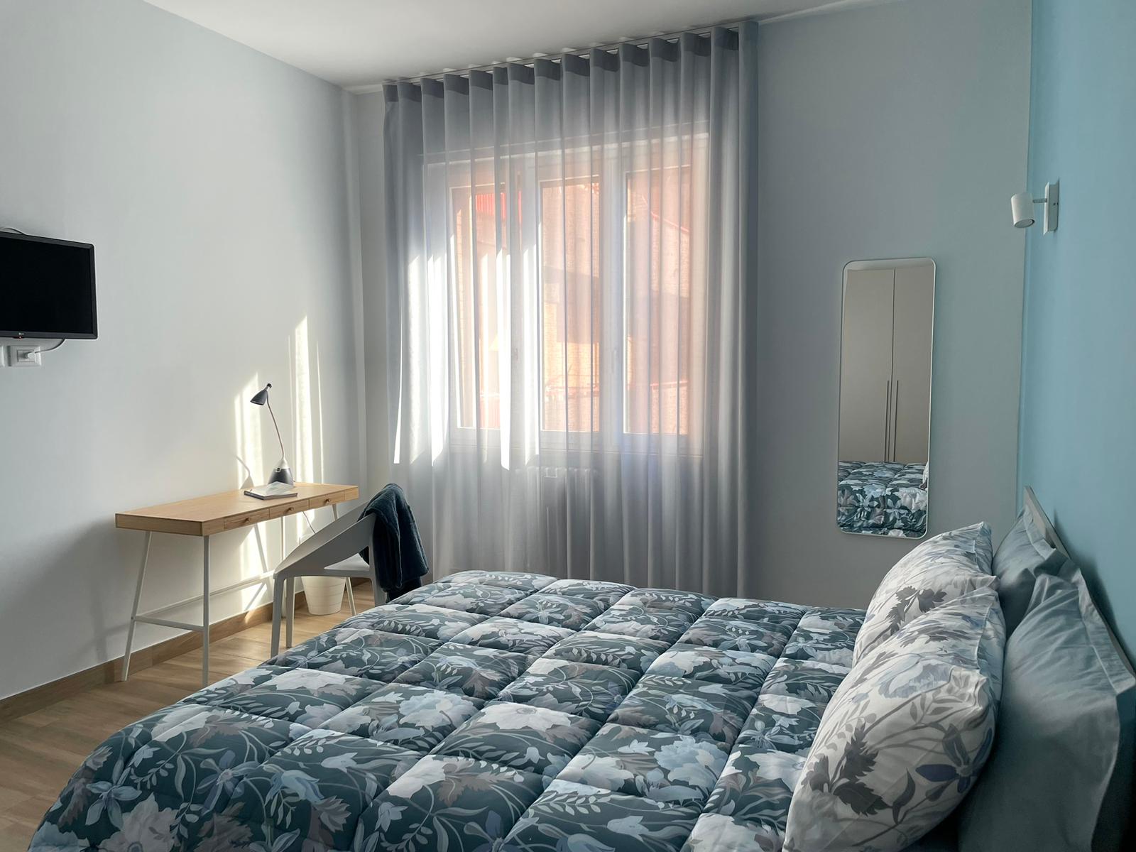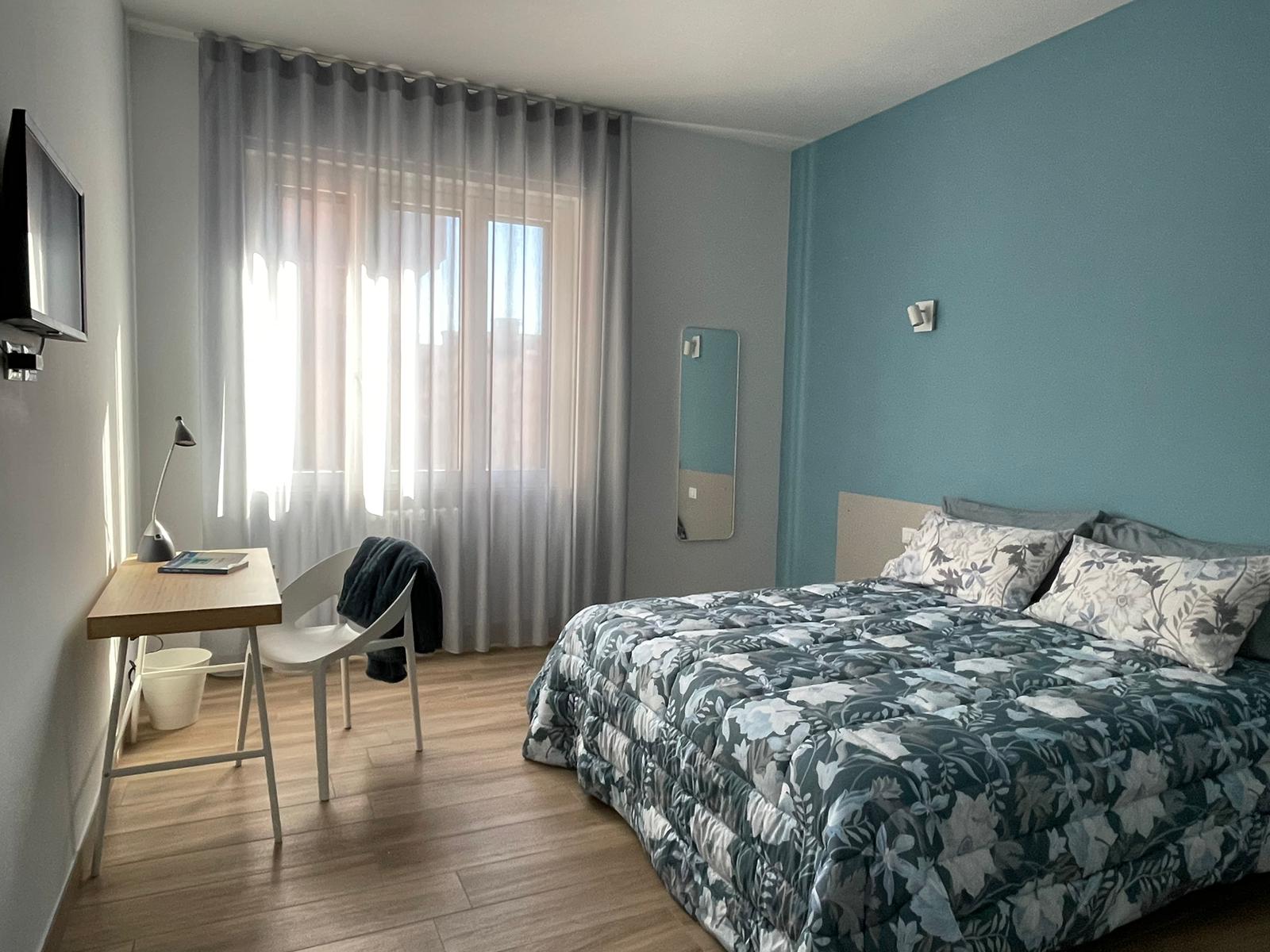 Camera doppia configurabile come matrimoniale o con letti singoli, dotata di postazione smart working e ampia finestra che dona luminosità alla stanza